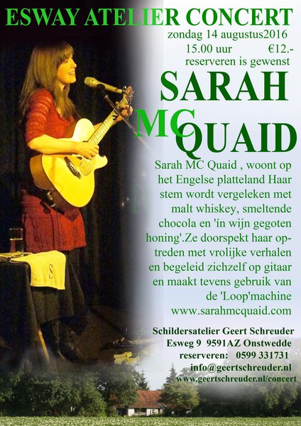 Esway Atelier Concert met Sarah MCQuaid, Singer songwriter zondag 14 augustus, om 15.00 uur aan de Esweg 9 te Onstwedde.