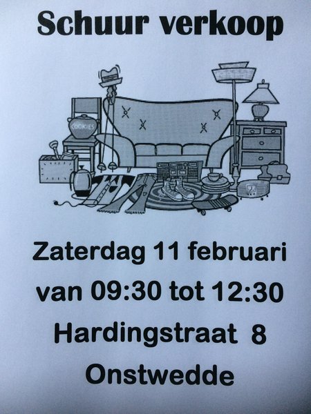 Zaterdag 11 februari van 9.30 uur tot 12.30 uur schuurverkoop.