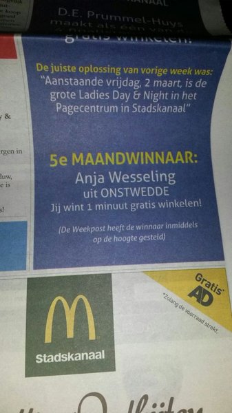 Met dank aan Anja's fanatiek puzzelende oma (mevr. Meems-Maarsingh) kon ze de oplossing van de puzzels uit de Weekpost insturen. Deze week ontving Anja een telefoontje van de weekpost met de melding dat ze 1 minuut gratis winkelen had gewonnen.
