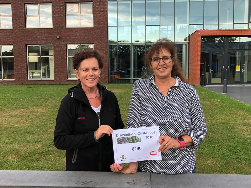 De organisatie had dit jaar een goed doel gekoppeld aan de Diamanttocht. Gekozen was voor het UMCG Kankerresearchfonds. Van elke inschrijving is een euro geschonken aan dit fonds die het geld inzet voor de financiering van projecten in het UMCG ter verbetering van het welzijn van kankerpatiĆ«nten. In de Bast kon daarom ook door de kinderen een verrassingscadeautje worden gekocht ; de opbrengst hiervan ging ook naar het goede doel. Incl. spontane giften is 260 euro overhandigd aan het UMCG KRF. Als herinnering kreeg iedere wandelaar een zgn. pin mee (zie foto); voor de kinderen was er een mooie medaille en de 5 trouwe viervoeters die hun baasjes vergezelden kregen een lekkere kauwstaaf.