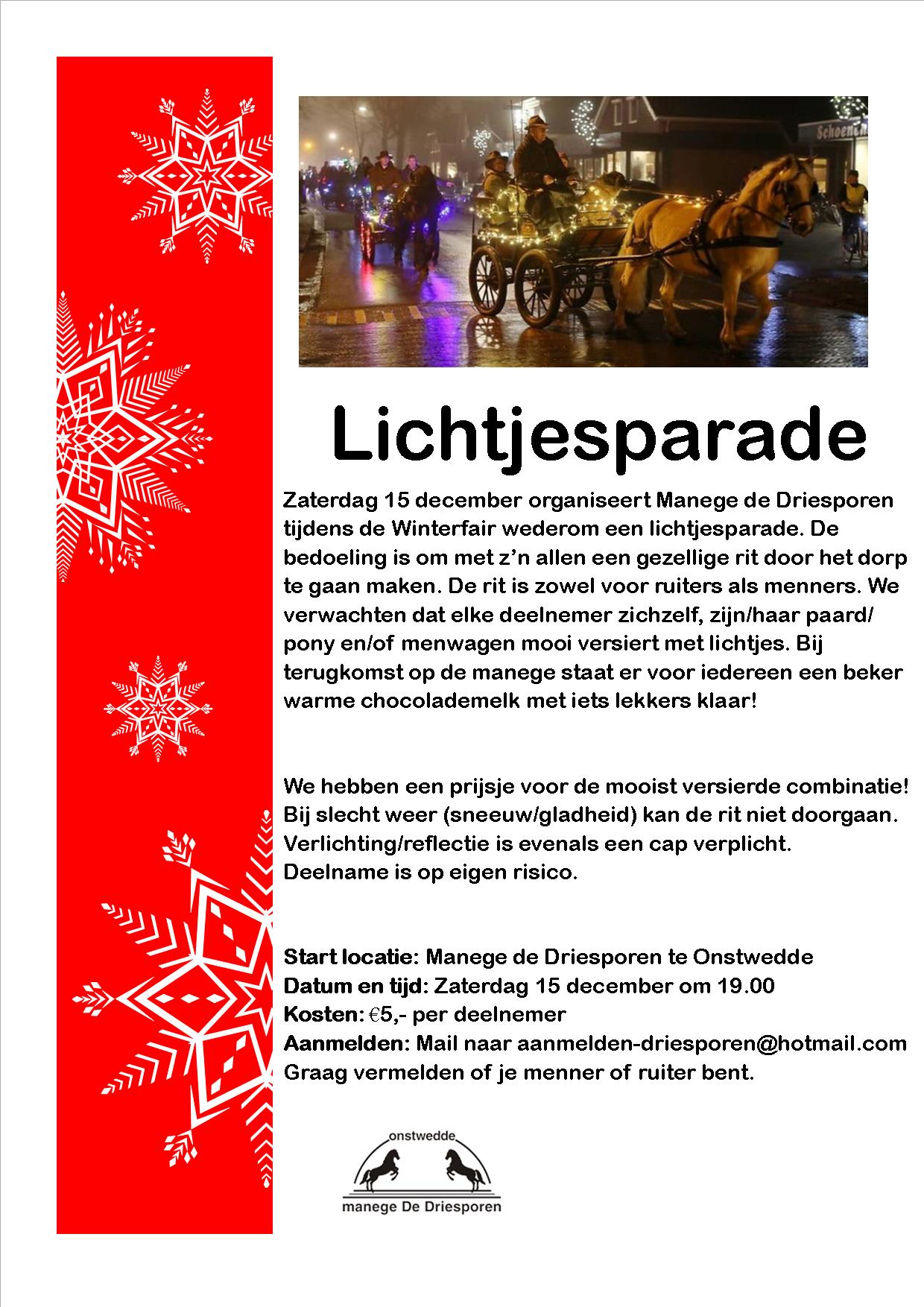 De lichtjesparade is een sfeervolle rit door het dorp voor zowel ruiters als menners. Alle deelnemers zullen zichzelf, hun paard/pony en/of menwagen prachtig versieren met lichtjes wat zorgt voor een prachtig tafereel passend bij de naderende feestdagen. Uiteraard is iedereen van harte welkom om de lichtjesparade onderweg of bij Manege de Driesporen te bewonderen. Bij terugkomst op de manege is er voor alle deelnemers warme chocolademelk met iets lekkers!