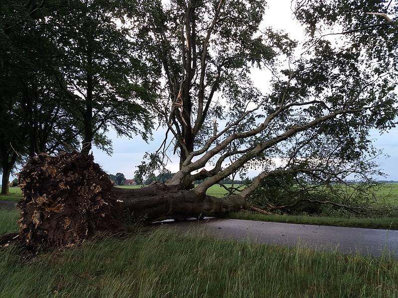 Boom op de Blekslageweg die de storm van vrijdagavond niet heeft overleefd.