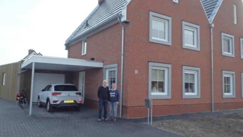 Wanneer ik aanbel bij de woning aan de Tuinlaan 16 is een monteur bezig met een laatste klus aan de ramen van het nieuwe huis van Eltjo en Alie Koerts. Een mooie geschakelde woning. Geen 2 onder 1 dak, maar 2 onder 2 daken.