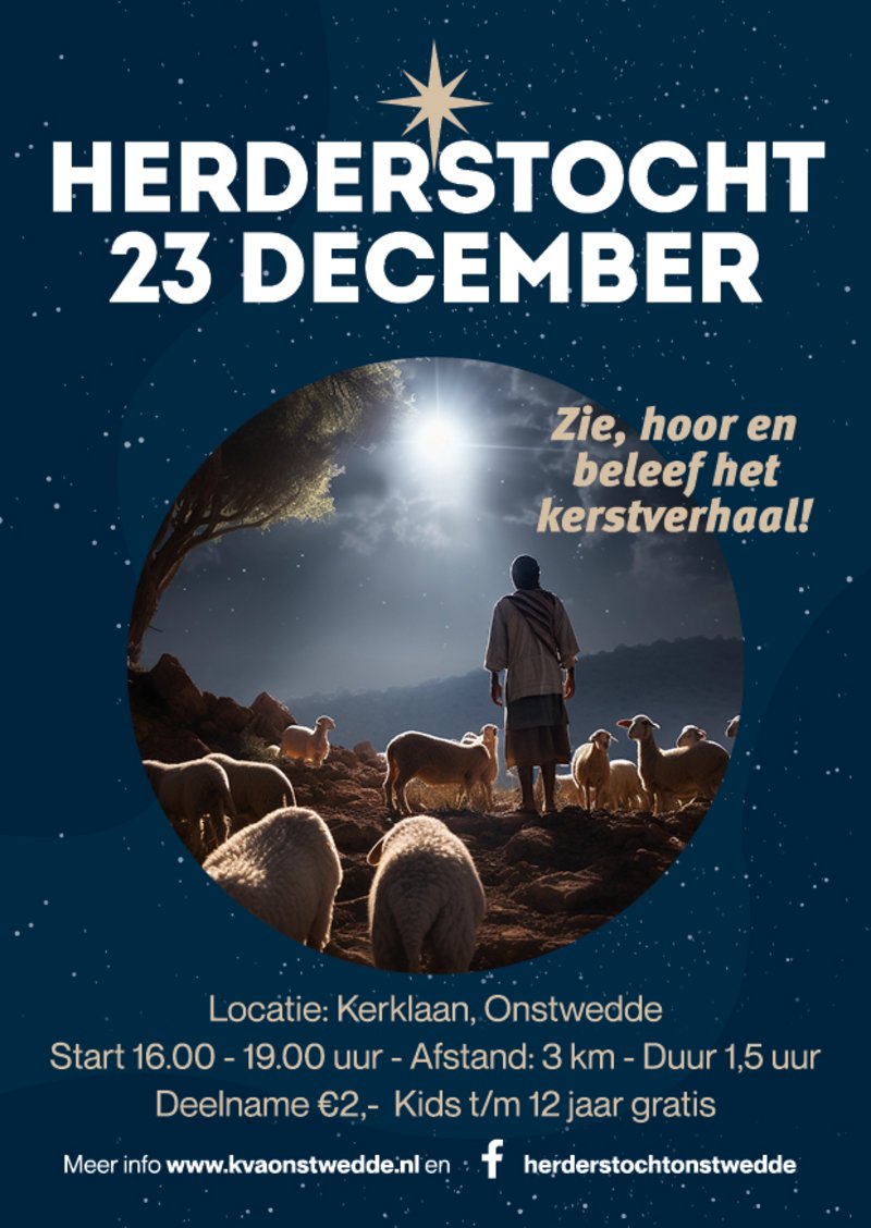 Op zaterdag 23 december 2023 nodigen wij iedereen uit om het Kerstverhaal te ervaren tijdens de derde editie van de Herderstocht in Onstwedde. Dit evenement biedt een prachtige gelegenheid om het Kerstverhaal te zien, te horen en te beleven in een sfeervolle omgeving.
