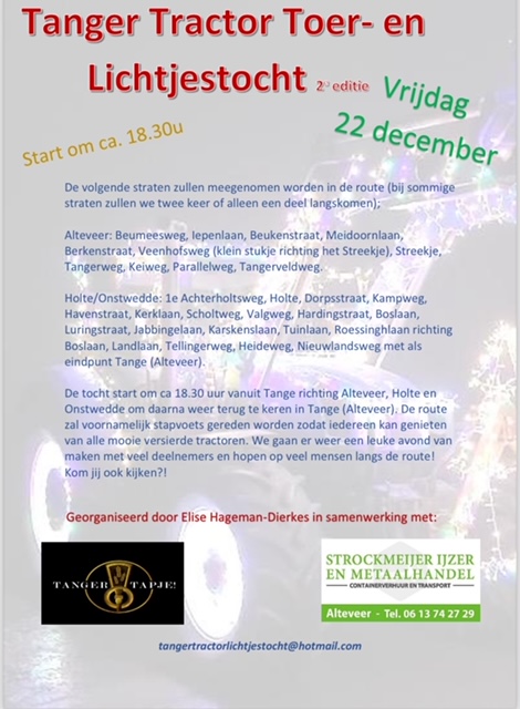 Het is de 2e editie van deze mooie Lichtjestocht met verlichte trekkers. Er zullen veel trekkers die avond meedoen (de opgave zit inmiddels helemaal vol dus opgave is helaas niet meer mogelijk). Een leuk uitje voor jong en oud om langs de route te komen kijken!