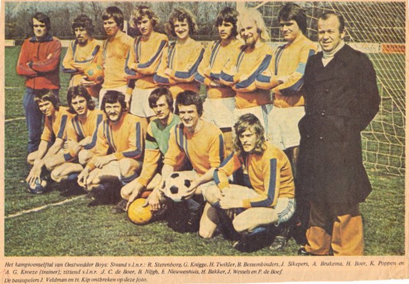 Vanaf 1974 ben ik nadrukkelijker aanwezig geweest in het dorp en dat had met verschillende zaken van doen. Ik had in Amsterdam met veel plezier en op een redelijk niveau gevoetbald. Op een gegeven moment begon het weer te kriebelen en heb ik mij ingeschreven bij de Onstwedder Boys. Men had in het dorp al van mijn bestaan kennis genomen maar waarschijnlijk nooit gedacht dat die ‘kunstenaar’ serieus aan voetballen zou denken. Ik denk dat voor de integratie in het dorp mijn bijdrage op het voetbalveld een belangrijke rol heeft gespeeld. Als speler van het eerste elftal heb ik nog een kampioenstitel en feest mogen meemaken. Mijn bijdrage als kunstenaar heb ik nog kunnen leveren door de spelers van het elftal in het gestencilde clubblad met een portret te vereeuwigen.
