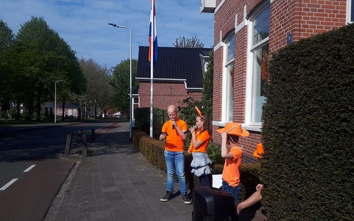 Evan, Janna en Berend zingen op Koningsdag om 10.00 uur het Wilhelmus. Foto: Anja Wesseling