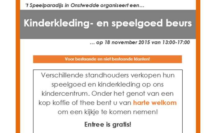 't Speelparadijs in Onstwedde organiseert een kinderkleding- en speelgoedbeurs op 18 november van 13.00 tot 17.00 uur Verschillende standhouders…