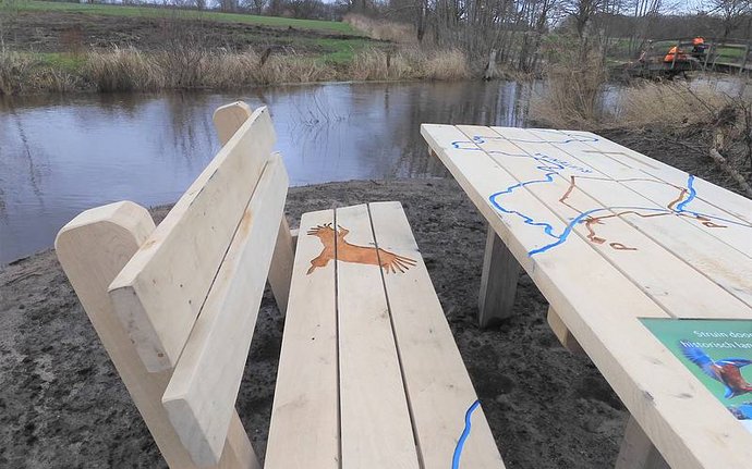 Nieuwe bank en tafel met daarin verwerkt 'het verloop' van de Ruiten Aa in Smeerling. Foto: Roelie Knigge Onstwedde.info