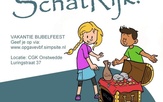 Vakantie Bijbel Feest met als thema: Schatrijk. Voor kinderen van 4 tot 12 jaar! Neem gezellig een vriendje of vriendinnetje mee.Knutselen, liedjes…