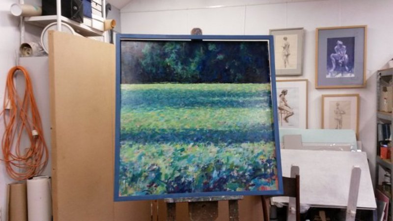Wat doorlooptijd betreft, verschilt het nog wel eens per schilderij. Soms is iets binnen een paar dagen af, een andere keer duurt het een paar weken. Soms haalt hij iets wat geschilderd is weer weg, en een andere keer komt er weer iets bij, en soms is het gewoon een paar keer proberen totdat hij tevreden is.