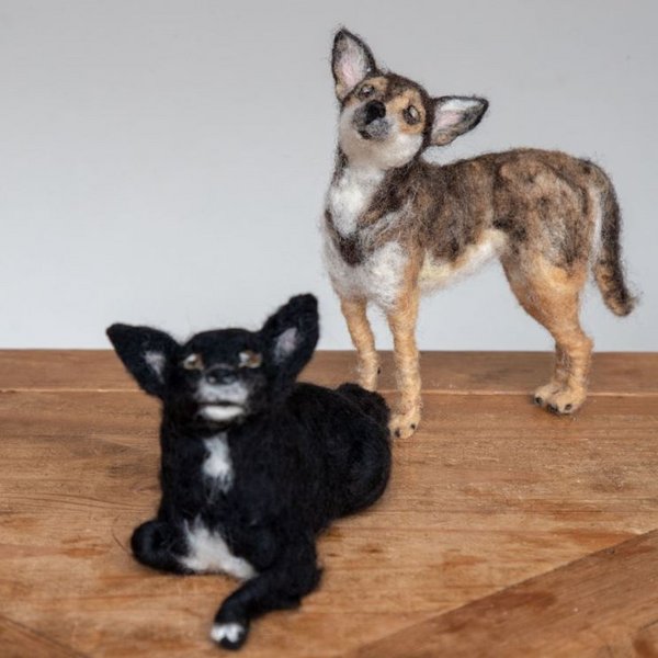 Nu zou je denken dat Jeanet wel genoeg uitlaatkleppen had voor haar creatieve geest, maar dan heb je het mis. Tijdens een bezoek aan een kerstmarkt zag ze een muisje liggen, gemaakt van vilt. Het muisje ging mee naar huis en daar is ze gaan experimenteren met vilten. Vilten doe je met wol, hier maak je een bolletje van en met een viltnaald prik je het in de juiste vorm. Maakt Jeanet bijvoorbeeld een hond, dan maakt ze eerst een frame van ijzerdraad en daar werkt ze de wol omheen. Om de juiste kleur te krijgen mengt ze verschillende kleuren wol, bijna net als het mengen van verf.