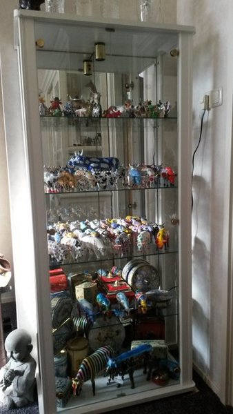 Een andere verzameling prijkt in een vitrinekast in de gang, waar verschillende Ford/New-Holland miniatuur trekkers hun plekje hebben gekregen. Pure hobby, met de verjaardag komt er vaak iets bij. Van de ene verzameling gaan we over op de ander, en dat is een kast vol koeienbeeldjes van het merk Cowparade, welke door Zwanie bijeen gespaard is. Koeien in verschillende soorten en kleuren, allemaal netjes opgesteld en ook weer vaak aangevuld na een verjaardag.