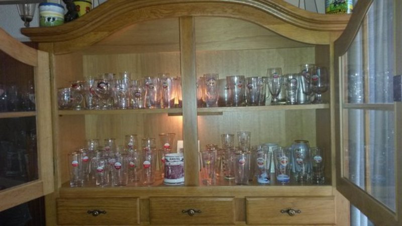 Als je denkt dat we bij alle verzamelaars in het dorp over de vloer zijn geweest dan heb je het mis. We kwamen er weer een aantal tegen tijdens ons bezoek, ditmaal aan de Kampweg. We waren welkom bij Aike en Zwanie Meems om een kijkje te nemen in de melkstal, maar terwijl we in de keuken aan tafel zitten kwamen we er al gauw achter dat hier heel veel meer te bekijken is. Een Amstel bierglazen verzameling staat uitgestald in een buffetkast, welke Aike door de jaren heen verzameld heeft. Hij gokt erop dat het er 150 in totaal zijn, en dat zijn er aardig wat met zowel nieuw als oud embleem. Af en toe ziet hij op een rommelmarkt of via marktplaats iets voorbij komen wat hij nog niet heeft, maar wanneer hij compleet is, hij heeft geen idee. `