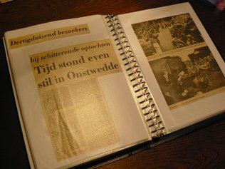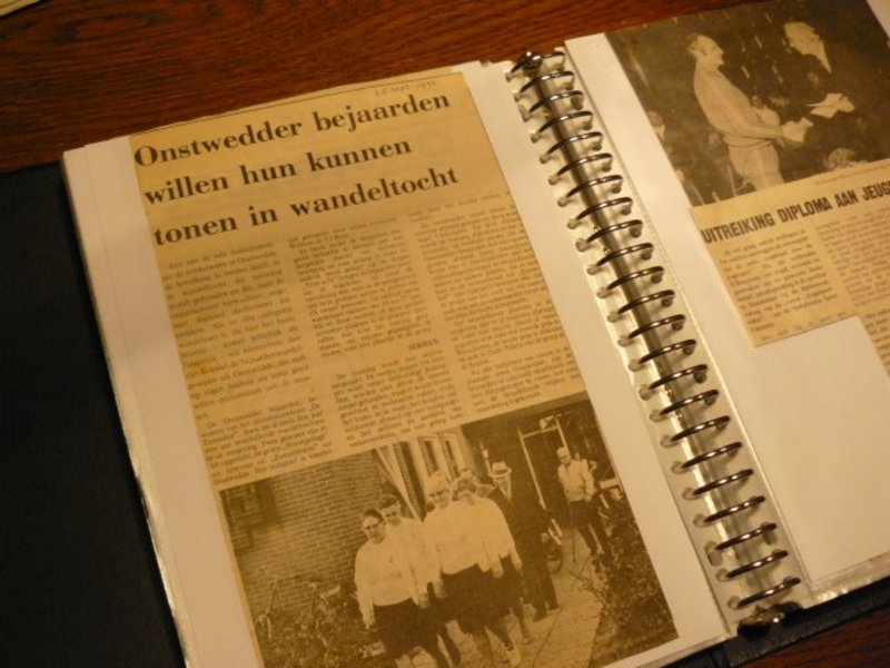 Toch houden ze naast hun grote belangstelling voor sport ook nog tijd over voor andere interesses. Terwijl we langs een van Grietjes verzamelingen lopen, een tafel vol potten met knopen, nemen ze ons mee naar de voorkamer waar een tafel staat met wat knutselgerei. Een schaar, fotoplakkers, wat krantenartikelen. Zodra Grietje de kast opentrekt komt er haast een compleet archief vol met plakboeken tevoorschijn, die laat zien dat het hier duidelijk om een arbeidsintensieve hobby gaat. Want als Jan voor de tv zit, zit Grietje aan haar tafeltje krantenknipsels uit te knippen waarin Onstwedde en Smeerling voorkomen, om deze toe te voegen aan haar verzameling waarmee ze al jaren geleden is begonnen. Hun liefde voor Smeerling blijkt met name uit de fotoboeken vol met foto’s gemaakt in Smeerling, kiekjes van buurtfeestjes tot aan een verzameling foto’s van alle Smeerlingse boerderijen bedekt door een dikke laag sneeuw.