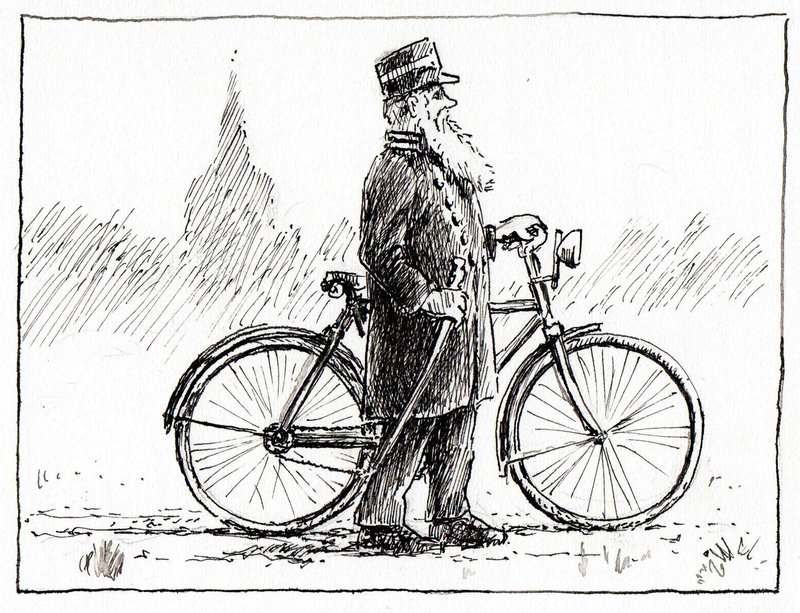 Aan z’n achterwiel zat in het verlengde van de wielas een lange pen. Als hij wilde gaan fietsen plaatste hij z’n linkervoet op die pen en het rechterbeen stond aan de andere kant van het wiel. Vervolgens begon hij te steppen (‘autopetten’ heet dat nog altijd in ons dorp), “Hup-hup!” en als de vaart erin zat, liet hij zich op het zadel zakken. Een mini-gevecht met de pedalen was daarna het standaard-vervolg en dan ……. fietste ‘De Wilke’.