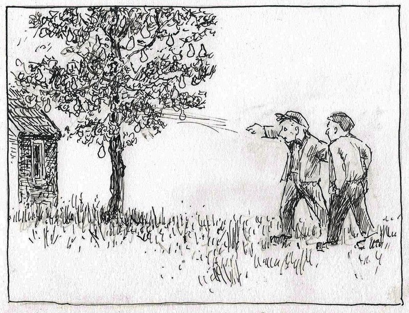 “Kiek ais”, zegt Geert, “wat hef Lutjeboer doar nog mooie dikke peren aan ’t boom zitten. Zol ik dai wol roaken kennen ? Wat ducht die ?” “Loaten we ’t om ’t ander doun”, zegt Jan.”Eerst ik en den doe.”